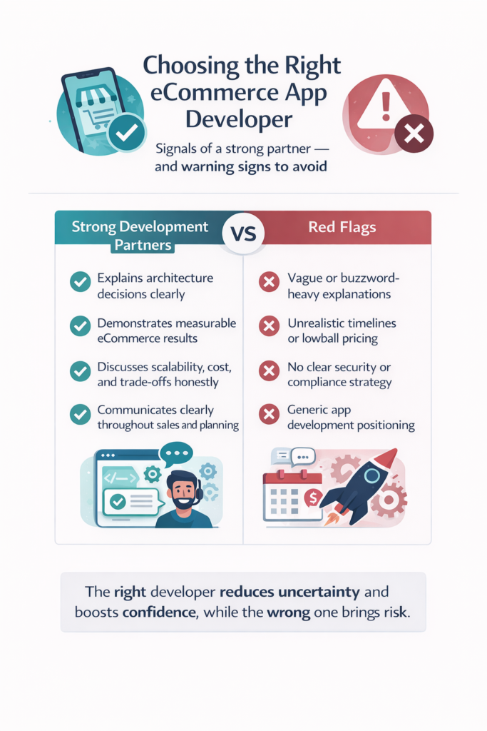 Developers lacking eCommerce-specific experience often build platforms that work initially but collapse under growth. Payment processing fails during peak traffic, inventory falls out of sync, or personalization systems can’t scale—each failure directly reduces revenue.