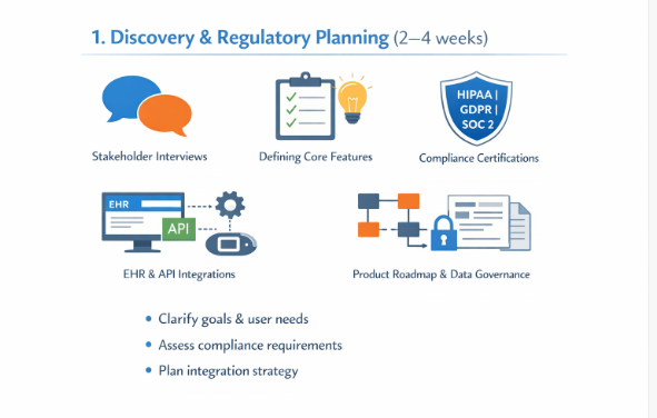 The engagement begins with a discovery phase that clarifies goals, user needs, and compliance obligations. The development company conducts stakeholder interviews, defines core features, and identifies necessary certifications such as HIPAA, GDPR, or SOC 2. Technical architects map integrations with EHR systems, APIs, or medical devices, while strategists outline the product roadmap and data governance structure.