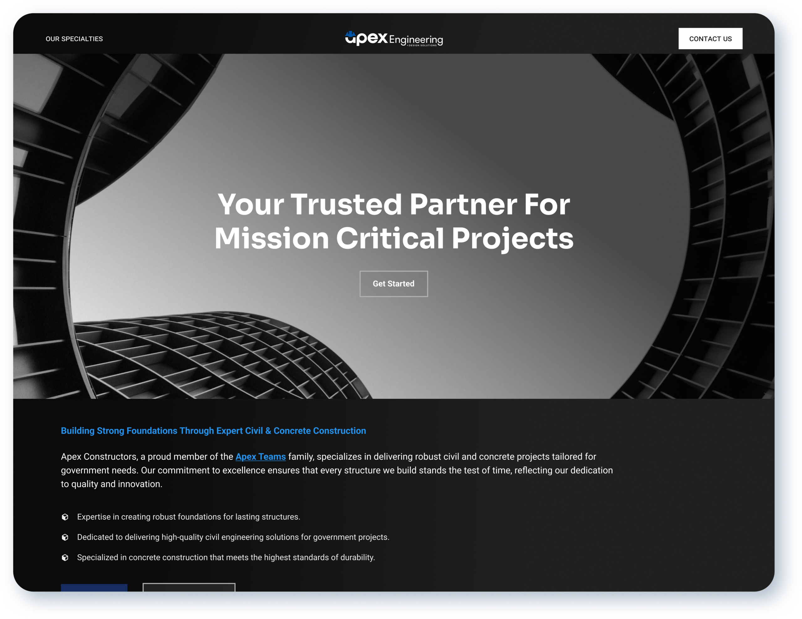 Apex Team’s website features dedicated micro pages for each specialized division, allowing visitors to explore specific capabilities while understanding how each fits within the broader organization. Apex Constructors showcases civil and concrete project expertise with bullet-pointed service lists and relevant case studies. Apex West presents mechanical systems and general construction capabilities with clear explanations of methodologies and outcomes. Apex Tactical Integration focuses on secure, specialized project capabilities that address high-security operations and niche services. A placeholder page for Apex Engineering outlines potential future services, ensuring the website remains adaptable as the business expands. Each micro page includes consistent navigation patterns, clear calls to action, and links that connect related content across divisions. This structure allows visitors to quickly find relevant information while understanding the collaborative team approach that differentiates Apex Team.
