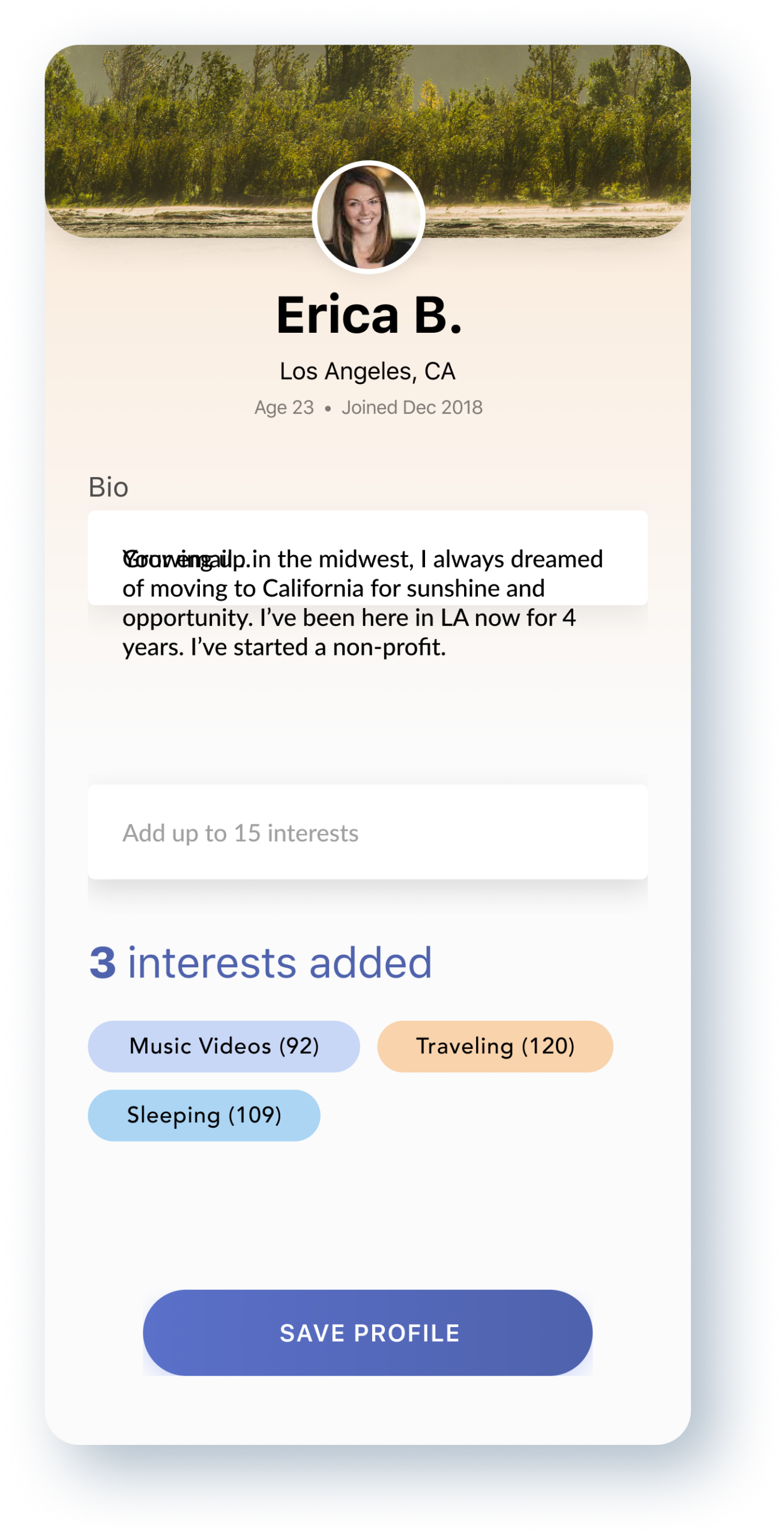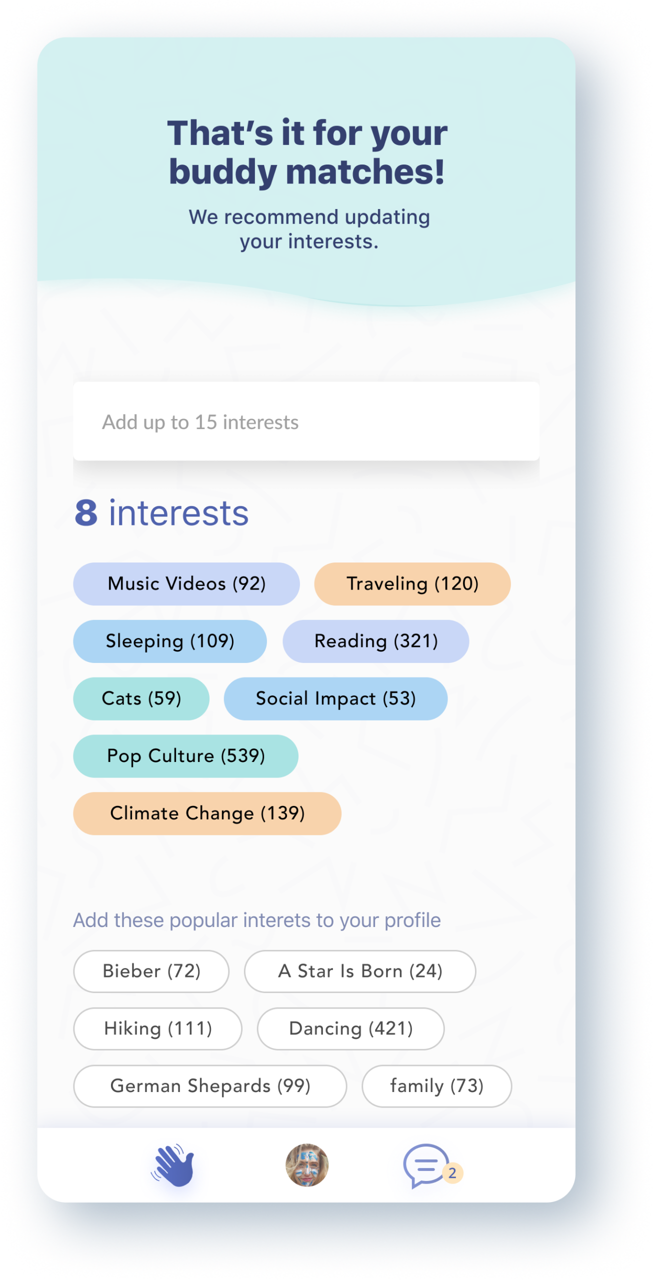 Users create profiles that truly represent who they are. They can add a profile image and cover image, write a personal bio, share their location, and most importantly, list their interests. As users begin typing interests, the system populates matching suggestions from other users, displaying how many people worldwide share the same passions. If an interest has not been added before, users can create it for future buddies to discover. This interest-driven approach ensures that every match is built on genuine common ground.