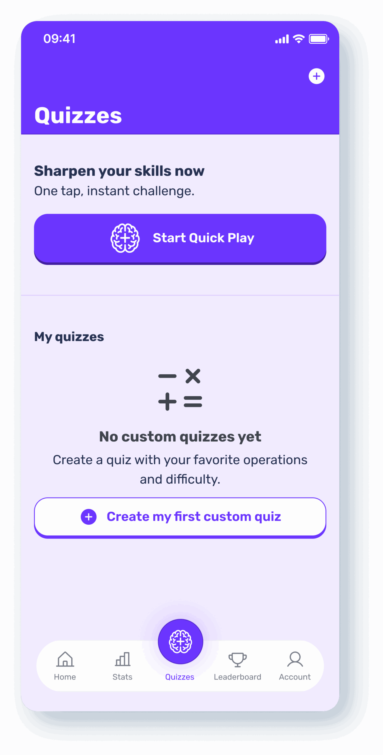 MathDistract is built for the 30 to 60 second window. From the home screen, users can launch Quick Start with a single tap and immediately drop into a timed quiz with no forms, no setup, and no tutorials. The engine serves up a stream of mentally manageable questions that can be answered with calculator style input, not multiple choice guessing. Whether you are in an elevator, on a couch, or waiting in line, you can open the app, complete a round, and close it again without friction. The app does not ask for a commitment. It simply offers a quick chance to feel sharp.