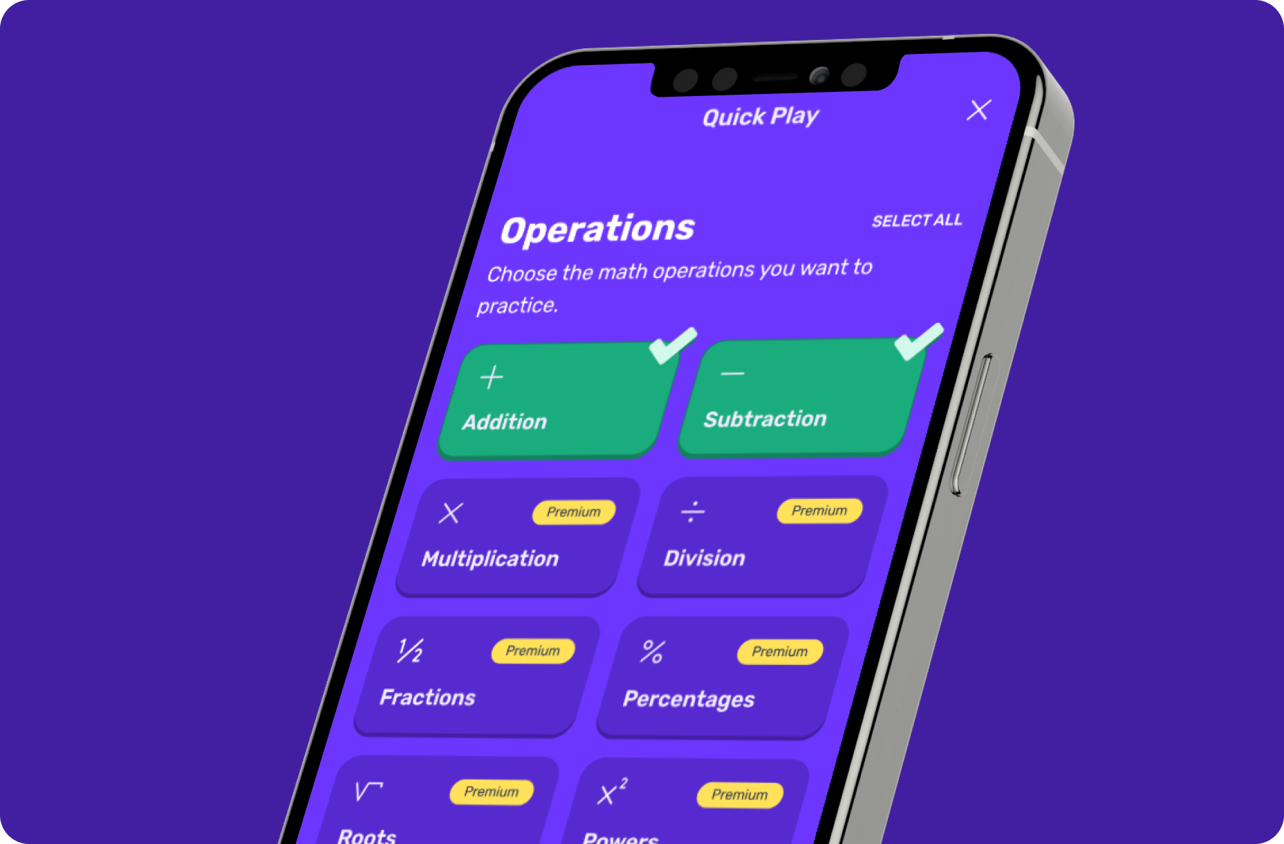 For Premium subscribers, MathDistract unlocks a full Custom Quiz Mode that lets players design the exact challenge they want. Users can choose operations, mix and match addition, subtraction, multiplication, division, fractions, percentages, powers, and roots, set a time limit between 30 seconds and 5 minutes, or pick a fixed number of questions such as 5, 10, or 20. The interface remains simple and touch friendly, so designing a custom challenge takes seconds, not minutes. The result is a game loop that feels personal without ever feeling complicated.