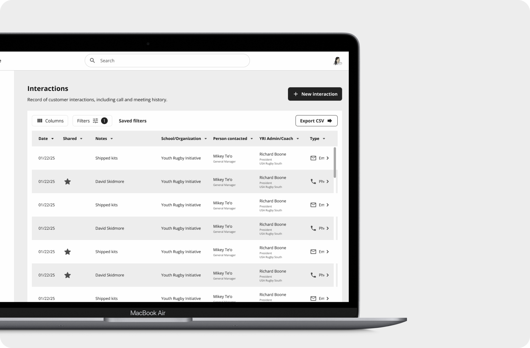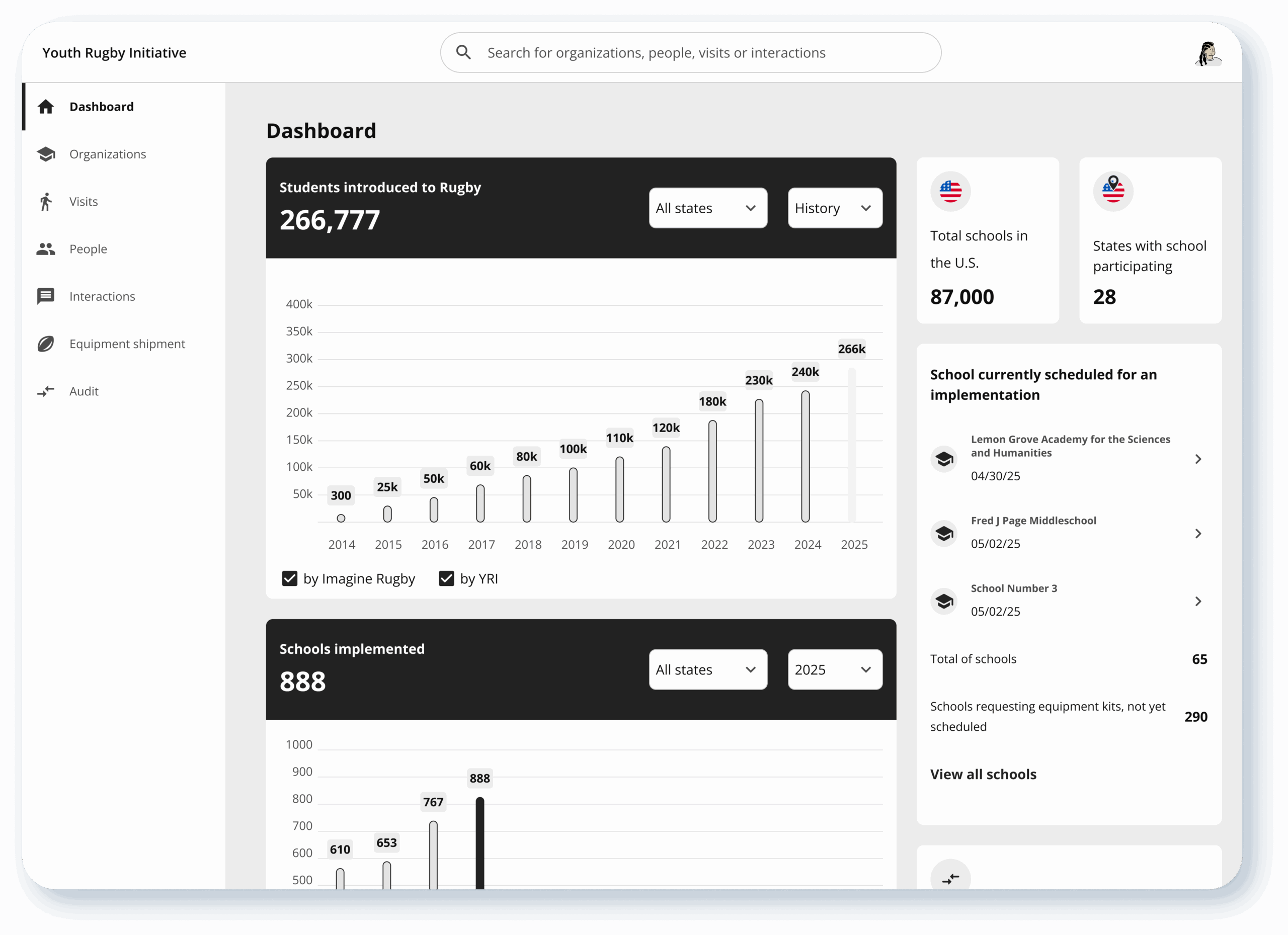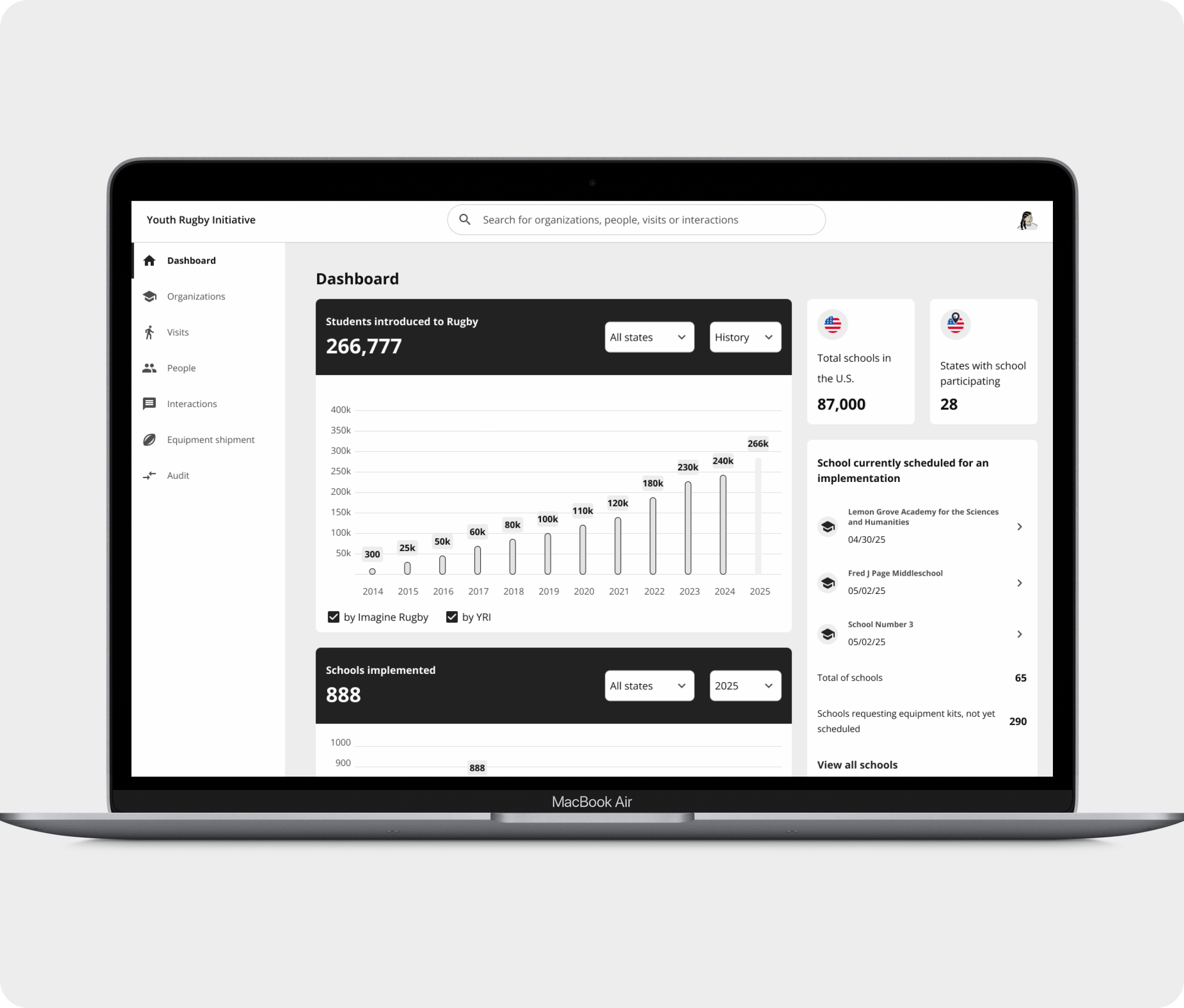 Before this collaboration, the US Rugby Foundation via the Youth Rugby Initiative team juggled thousands of schools, volunteer coaches, and equipment shipments through disconnected tools. Critical data lived in silos, making it nearly impossible to see the big picture—or even confirm whether a kit reached its destination. Our design-first partnership re-imagined those workflows as a single, device responsive-friendly experience that captures every visit, every kit, and every student reached in real time. By translating months of discovery into a high-fidelity prototype and now meticulous code, we’re giving YRI the operational clarity it needs to ignite a love of rugby in one million kids.