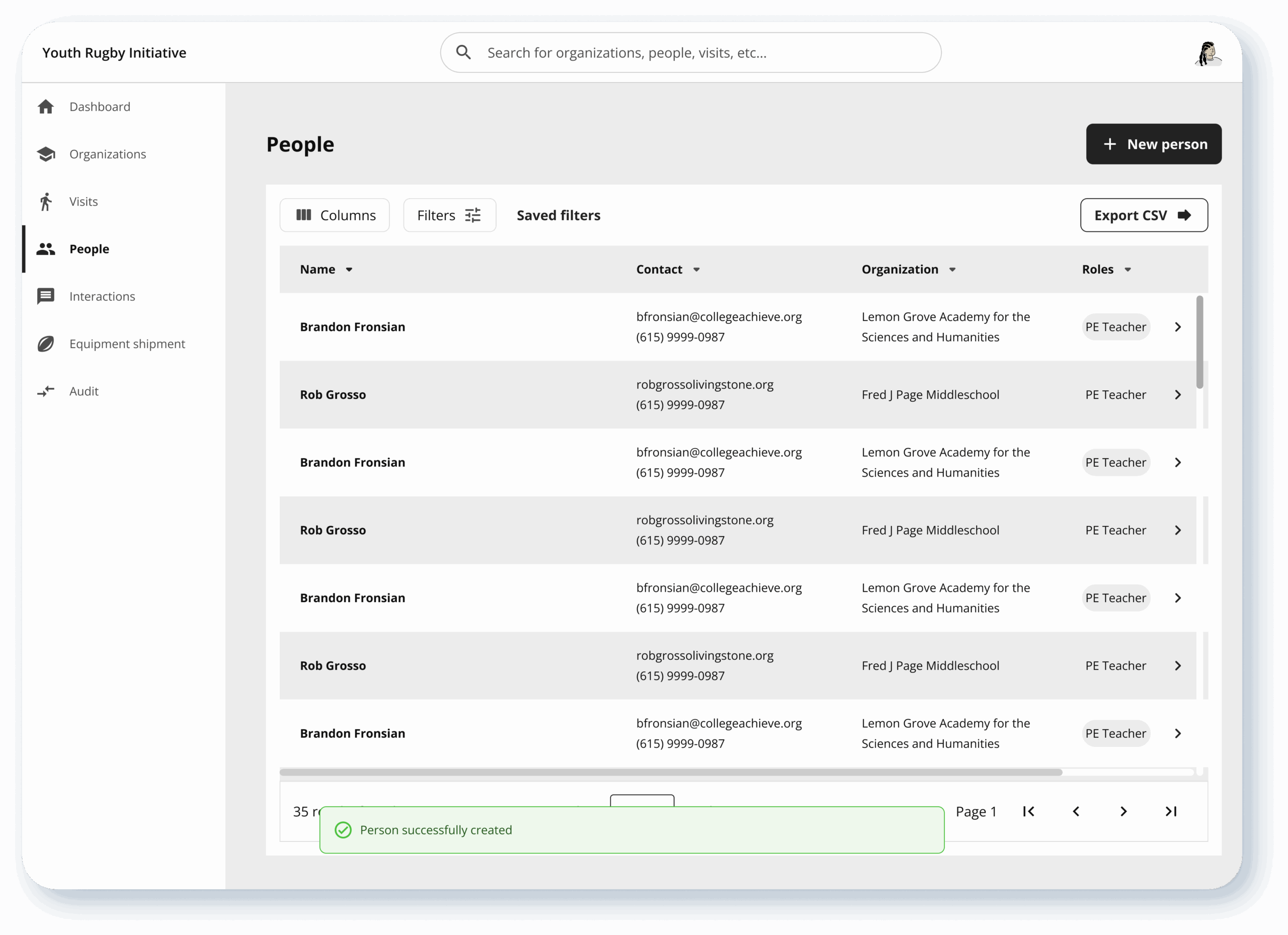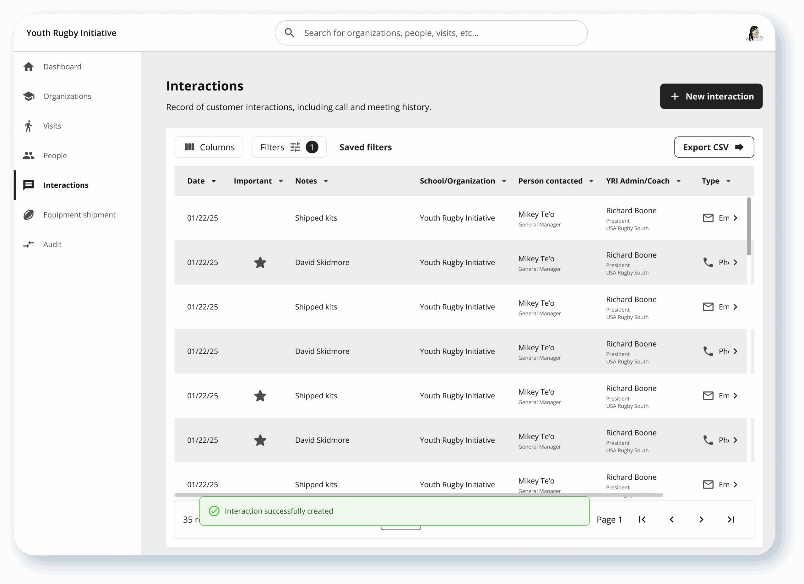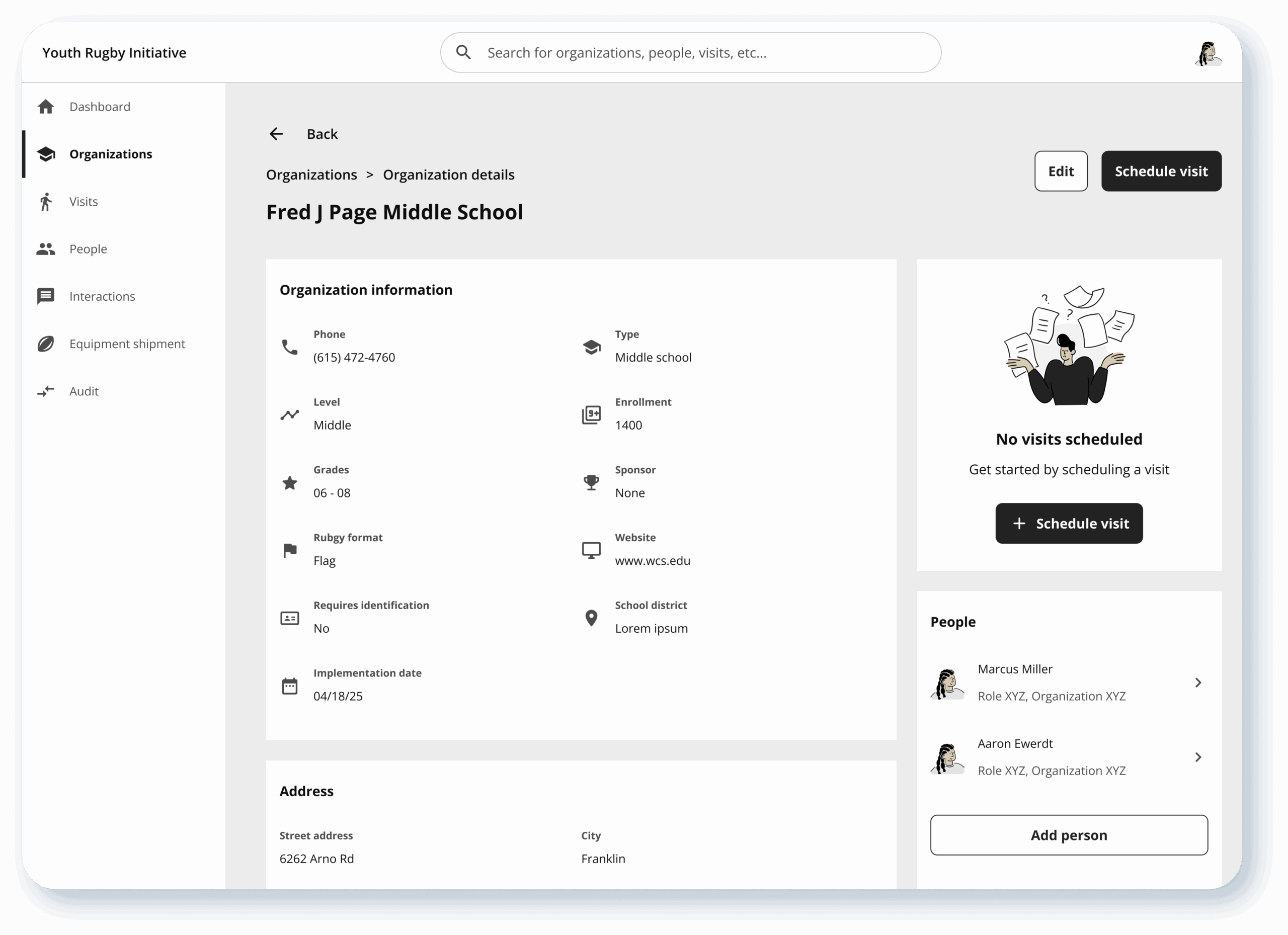 Before this collaboration, the US Rugby Foundation via the Youth Rugby Initiative team juggled thousands of schools, volunteer coaches, and equipment shipments through disconnected tools. Critical data lived in silos, making it nearly impossible to see the big picture—or even confirm whether a kit reached its destination. Our design-first partnership re-imagined those workflows as a single, device responsive-friendly experience that captures every visit, every kit, and every student reached in real time. By translating months of discovery into a high-fidelity prototype and now meticulous code, we’re giving YRI the operational clarity it needs to ignite a love of rugby in one million kids.